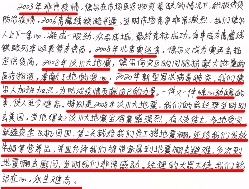 2008年,對于我們每一個中國人,是不平凡不同尋常的一年,也是沉痛的一年,更是難忘的一年。那年發(fā)生了震驚世界的5.12汶川大地震。那幾天電視天天報道災難帶來的不幸,以致每天心懷悲痛的看著電視上的傷亡情況。一次無意識的看電視機會,我看到了寶雞電視臺采訪我家張華總經(jīng)理,我激動的喊我父母過來看,因時間久遠具體記得不太清楚了。但講述的內容至今歷歷在目。是張總經(jīng)理以德爾公司總經(jīng)理的身份為我們四川受災同胞捐款的事跡。當時高三的我就覺得這是很偉大的愛國情懷和忘我無私的愛國情操,心系受災群眾,為國家為人民貢獻自己的力量。讓多日以來沉重的心情受到些許的感動與溫暖。災難無情,人間有愛,希望就在眼前!
